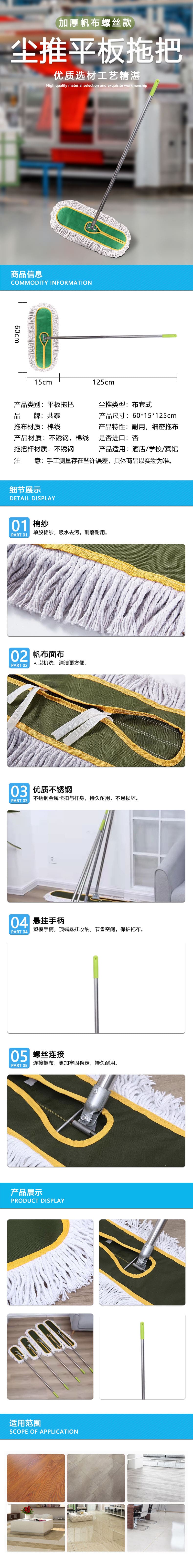 描述:共泰 尘推平板拖把 宽头棉线拧水拖把 免手洗商用线拖 加厚帆布螺丝款 60*15cm